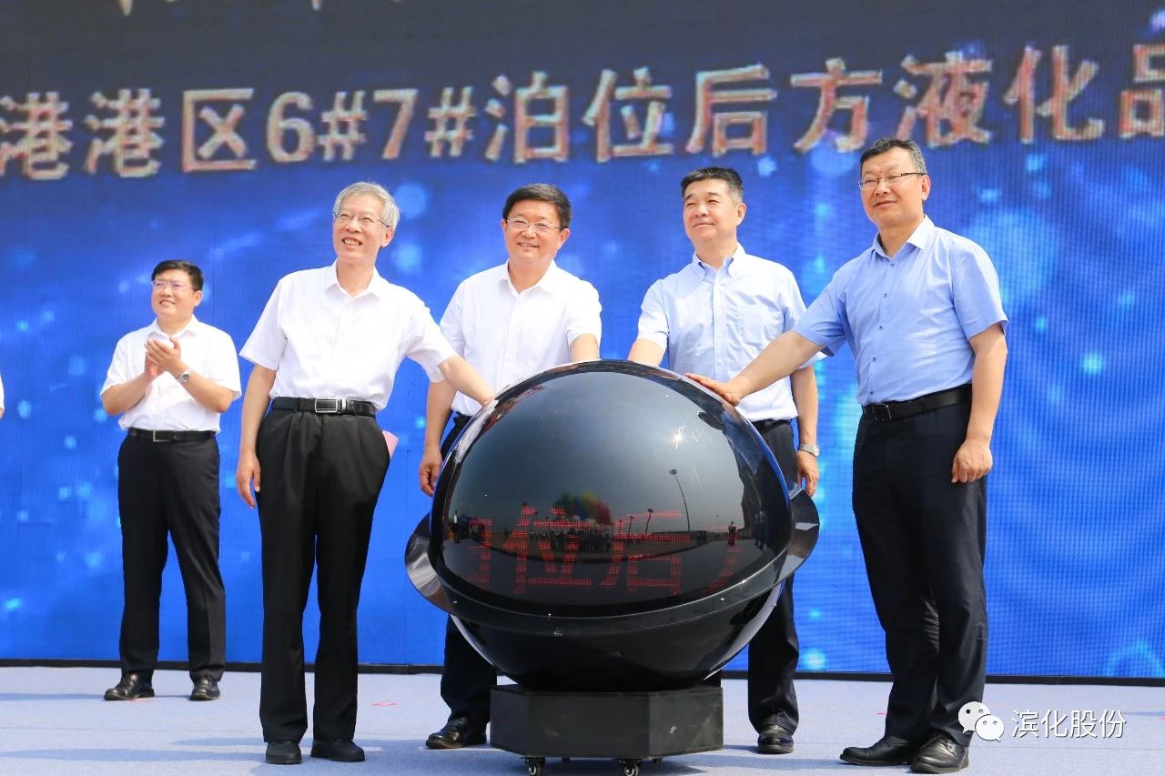 佘春明、霍高原、李奉利和曹玉斌共同按动项目启动器滨州港海港港区6#7#泊位后方液化品储运区项目正式开工